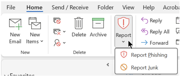 At GVA, we have a method to report dangerous phishing emails. In your Outlook ribbon, there is a button labeled “Report”. You can use this button to report either a Phishing email or a Junk email you receive. This will send a report to our email servers so they can better classify messages in the future.