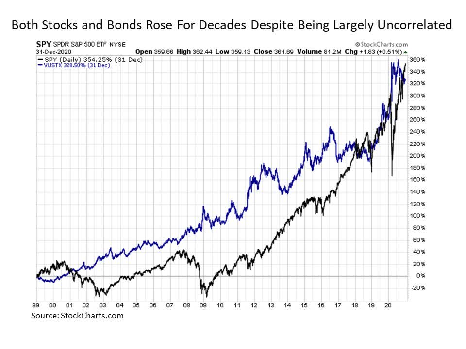 This inflation outbreak presented a problem for both stocks and bonds. Historically, the correlation of returns between U.S. stocks and long-term U.S. Treasuries has been around -0.11. On a scale from -1.00 to 0.00 to +1.00, this represented “very low negative” correlation teetering on the brink of being “uncorrelated”. In other words, stocks and bonds generally move in their own direction on any given trading day, which enabled both stocks and bonds to rise over long-term periods of time. This is shown in the chart below for the period from 1999 to 2020 where stocks and long-term U.S. Treasuries generated comparably positive cumulative returns despite traveling their own total return path at any point in time along the way.