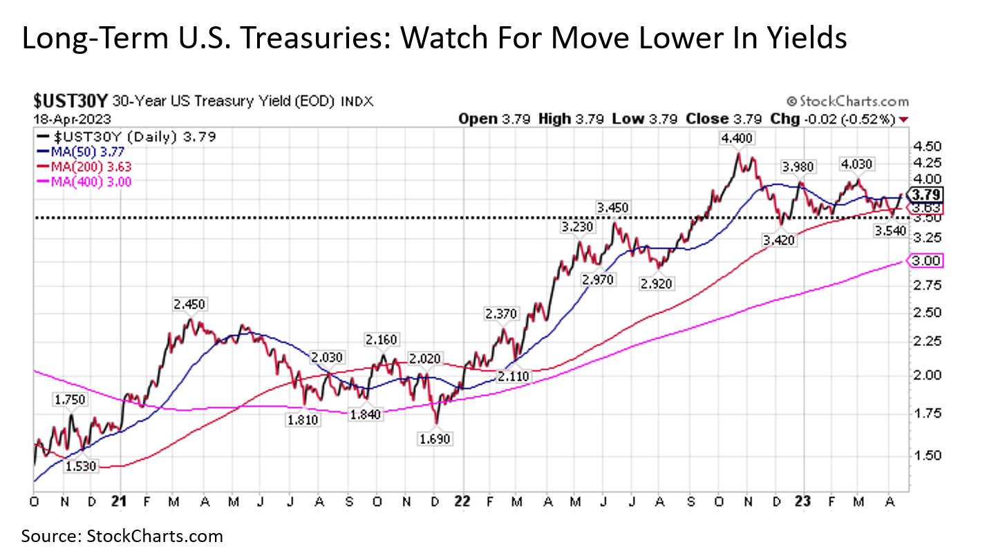 A key level I am watching in the current environment for signs of further sustained upside from the U.S. Treasury market is the 3.5% yield on the 30-Year Treasury bond. Following the strong rally in price (and decline in yields) for long-term Treasuries since October, the 30-Year Treasury bond has approached this yield level on four separate occasions since December, only to see yields turn back higher. If the yield on the 30-Year Treasury can break decisively below this latest resistance level, the next stop in yields would be measurably lower in and around the 3.0% level. The breakout that has already occurred in shorter duration Treasury instruments suggests that such a breakout for the long bond. And it should be noted that any such surge in bond prices and subsequent declines in yields has a feedthrough effect of helping to support stocks and their valuations.