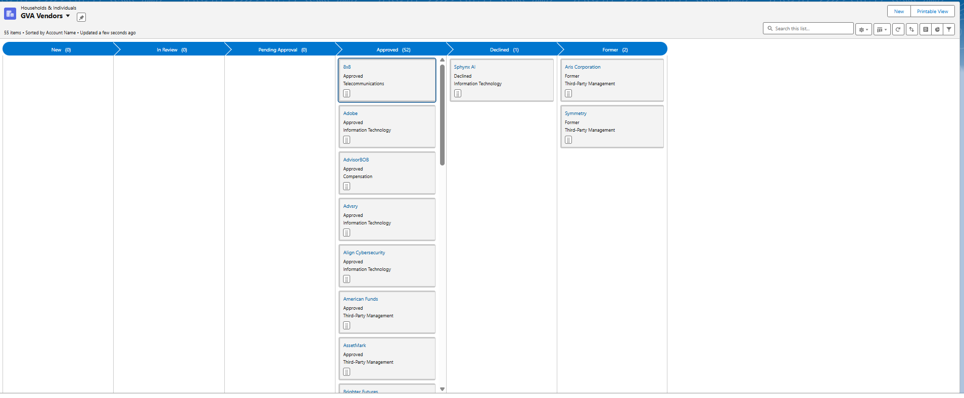 Centralizing vendor information in Salesforce allows us to maintain accurate, consistent, and up-to-date records across the network. This functionality strengthens our “single pane of glass” approach—giving advisors and teams reliable access to the information they need, when they need it.