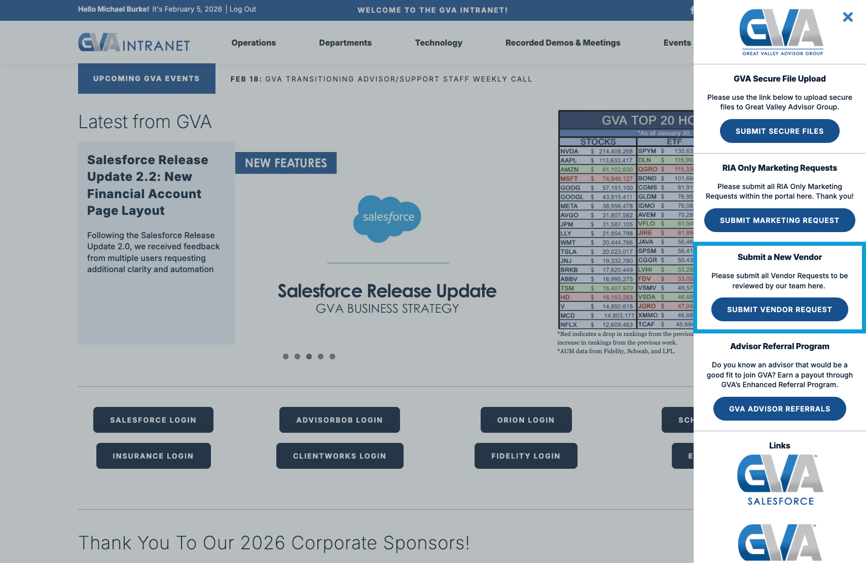 A new Vendor Request feature is now live on the GVA Intranet (gvaria.com), making it easier than ever to submit new vendor requests for review by GVA Compliance.
